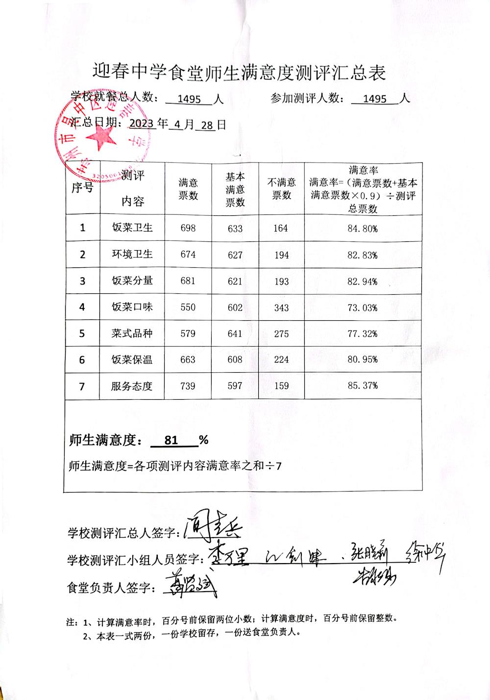 2023年4月迎春中学食堂师生满意度测评汇总表