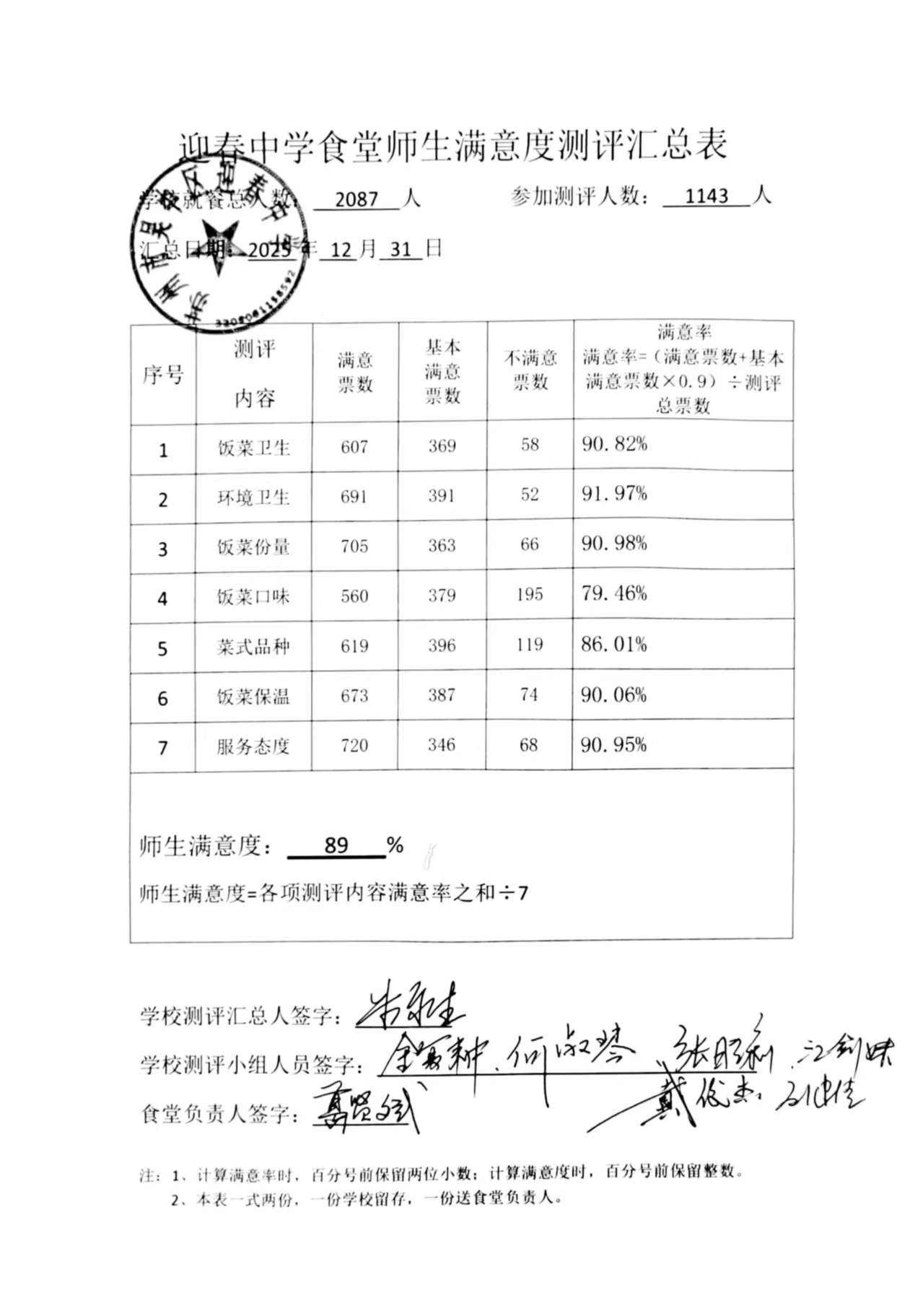 2025年12月迎春中学食堂师生满意度测评汇总表